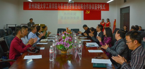 4月19日,beats365官网入口工商公司与荔波旅游集团战略合作协议签字仪式在工商公司会议室举行。荔波县委常委、副县长、荔波旅游集团菫事长玉可雕一行6人,beats365官网入口副董事长缪坤和,工商公司经理肖小虹等领导及相关师生出席签约仪式,仪式由工商公司副经理胡北明主持。