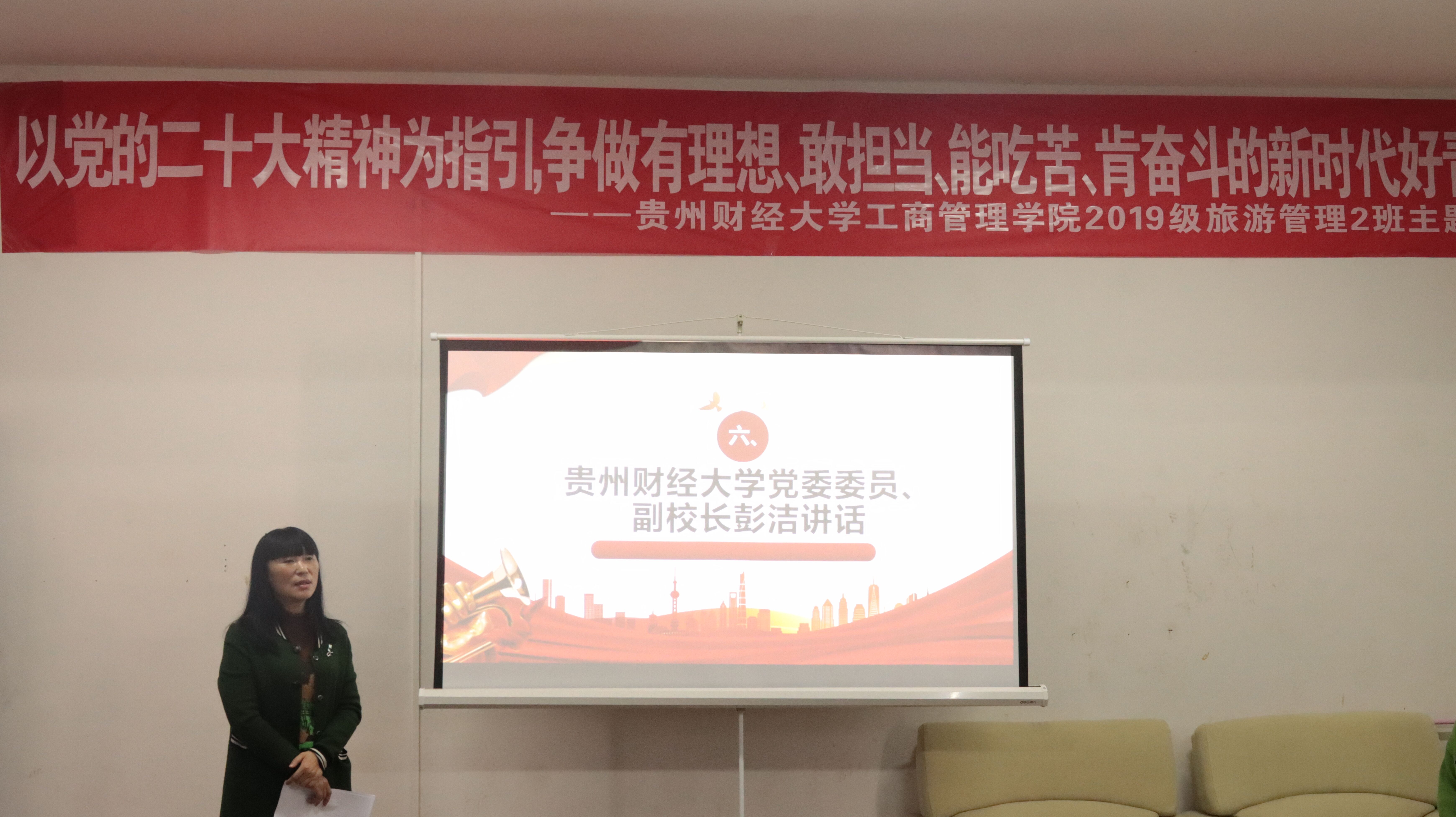 11月18日上午,beats365官网入口在员工社区翠竹2栋四楼活动室开展了“以党的二十大精神为指引,争做有理想、敢担当、能吃苦、肯奋斗的新时代好青年”主题班会。公司党委委员、副董事长彭洁,工商管理公司党委书记杨阳,党委副书记何瑞,2019级旅游管理二班全体同学参加,本次班会由蒋小芳老师、苏浩鹏同学主持。