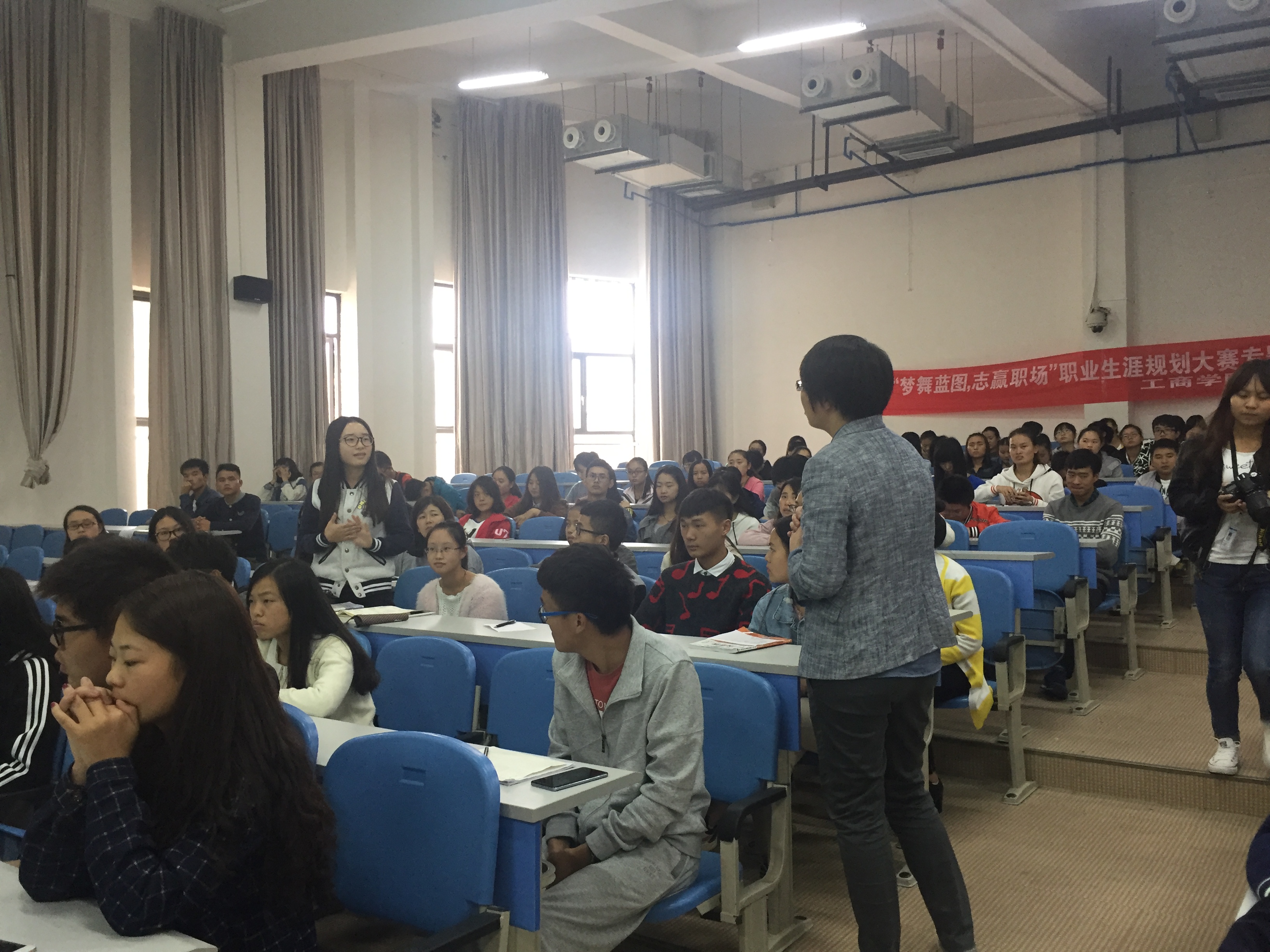 杨洁教授讲解了自我认知的测评方法,强调进行职业环境分析是做好职业规划的重要依据,并现场解答了同学们的疑问。