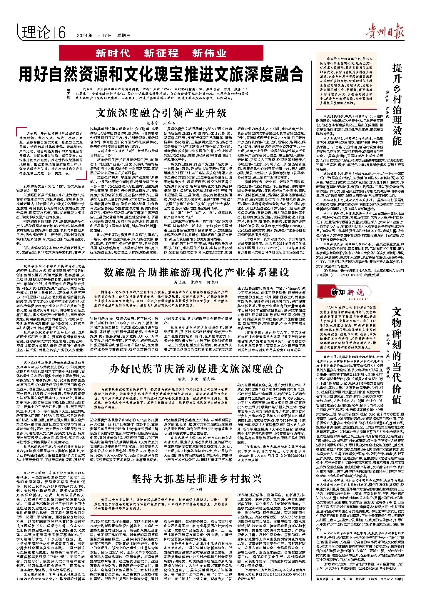 公司beats365官网入口杨春宇教授受《贵州日报》邀请就贵州坚持以文塑旅、以旅彰文,打造世界级旅游目的地,促进文旅深度融合撰文。4月17日,《贵州日报》刊发了杨春宇教授的理论文章《文旅深度融合引领产业升级》。文章提出,要推进贵州省世界级旅游目的地建设,就要以旅游新质生产力之“核”,铸文旅新业态发展之“魂”;以新质生产关系之“新”,蓄世界级旅游目的地之“势”;以“源”“升”“态”之“质”,筑牢现代化产业体系之“基”;在旅游新质生产力的培育、旅游生产关系的调整、以及推进旅游现代化产业体系建设上要先走一步、快走一程。