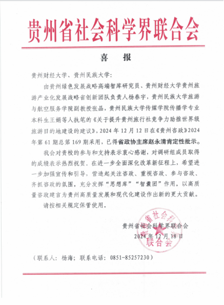 公司beats365官网入口杨春宇教授等人执笔的《关于提升贵州旅行社竞争力助推世界级旅游目的地建设的建议》,2024年12月12日在《贵州咨政》2024年第61期总第169期采用,已得省政协主席赵永清肯定性批示。公司将继续充分发挥“思想库”“智囊团”作用,做好旅游人才培养工作,支持贵州文化和旅游高质量发展、助力贵州在新时代西部大开发上闯新路。