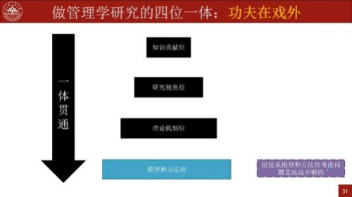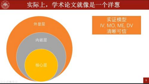 刘德鹏副教授提出的“四位一体”,其核心逻辑是倡导“训练有素的想象力”,明确知识贡献是研究的最高导向,并非机械的运用写作技巧。“四位一体”包含了四个结构层面,即外显层、内嵌层、价值层。外显层为实证模型(变量关系);