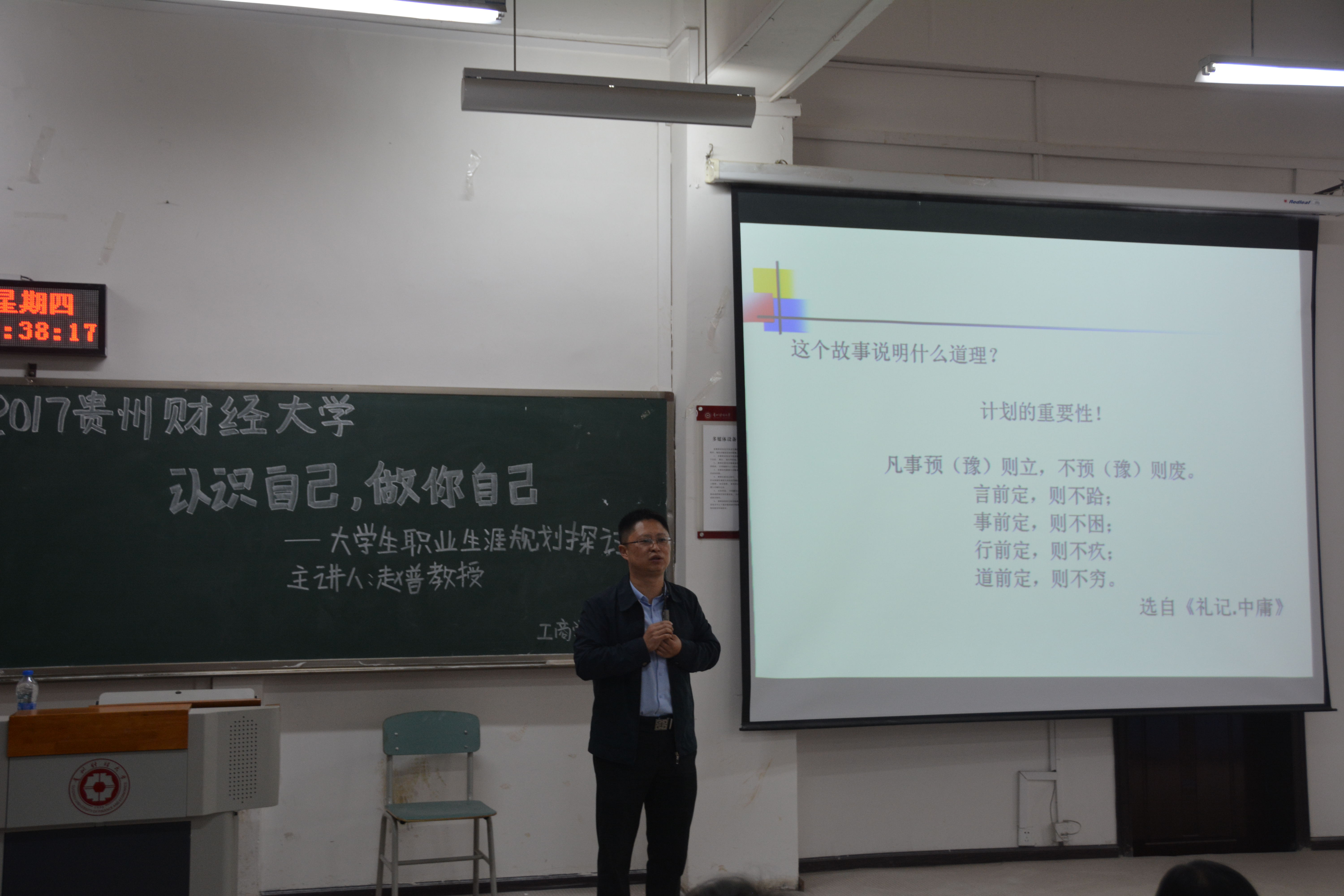 2017年10月12日中午,由beats365官网入口人才招聘处主办、beats365官网入口工商公司承办的“规划自我,博弈未来”老员工职业生涯规划大赛专题讲座在进学楼2-1阶梯教室拉开帷幕。公司党委副书记范嘉虹、副书记陈劲松、团支部书记孔淑华到场观看,beats365官网入口副董事长赵普教授的讲座以“认识自己,做你自己”为主题展开探讨。