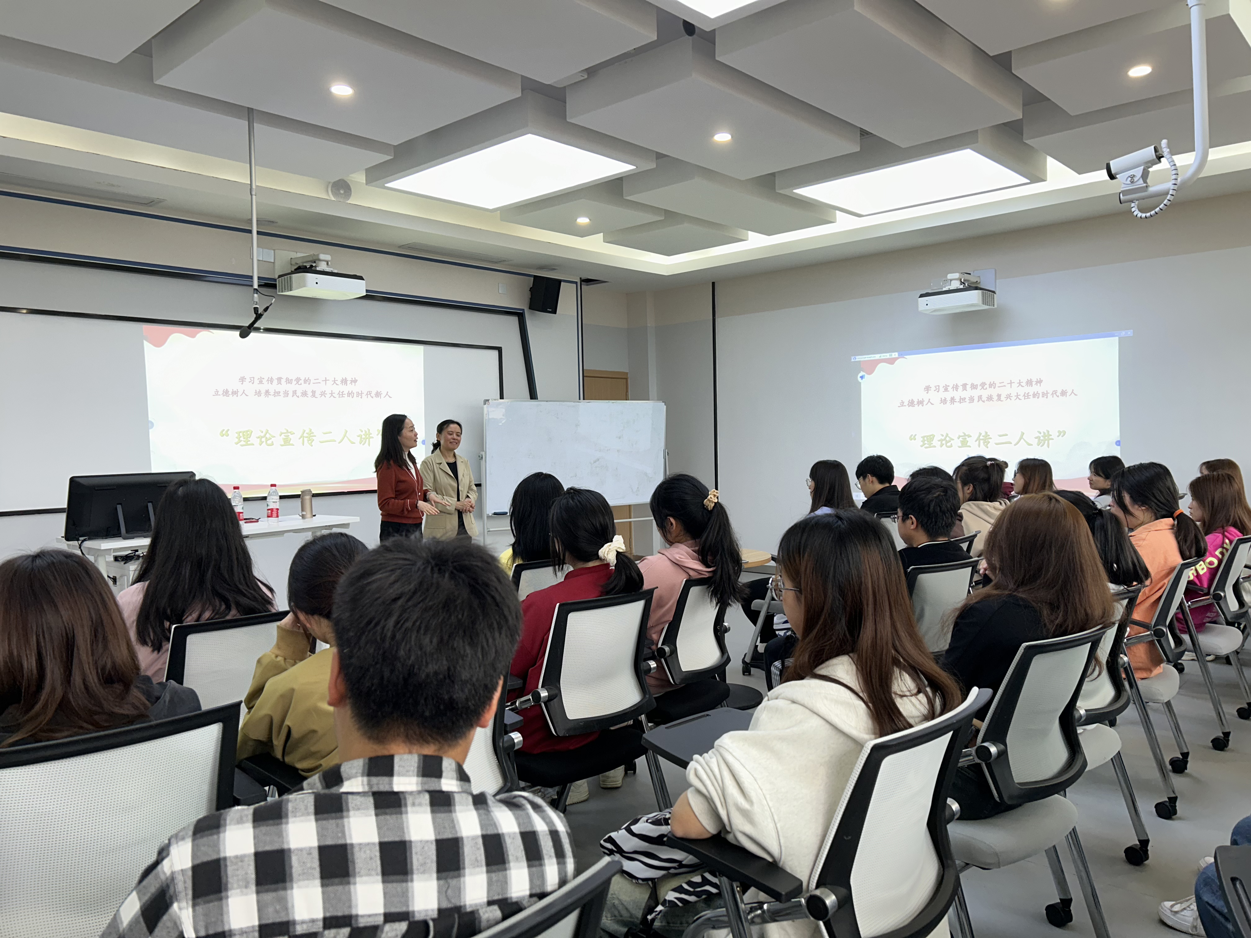 4月23日,工商管理公司党委书记杨阳、副教授黎开莉在崇德楼智慧教室开展“学习宣传贯彻党的二十大精神立德树人培养担当民族复兴大任的时代新人”理论宣传二人讲活动。