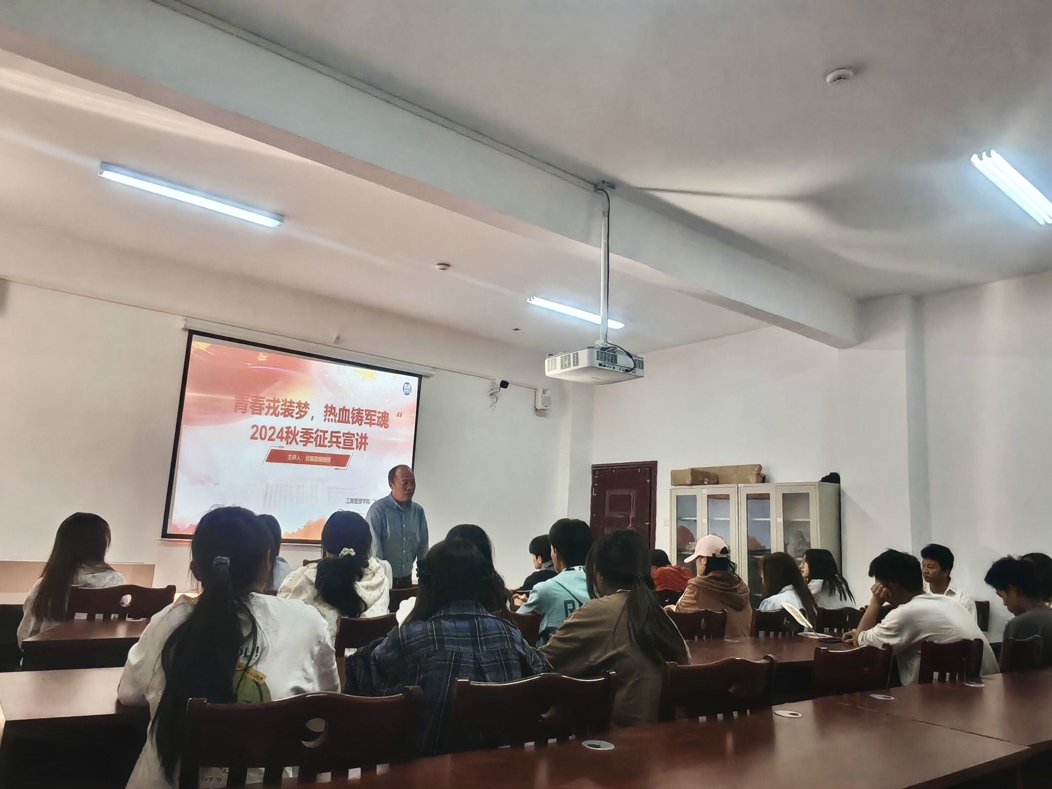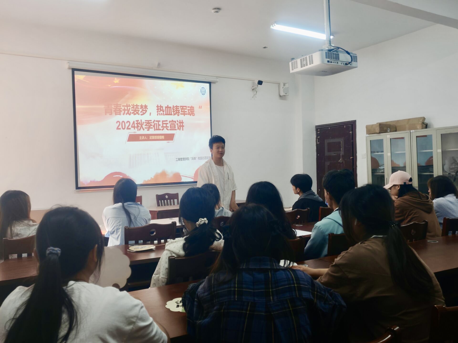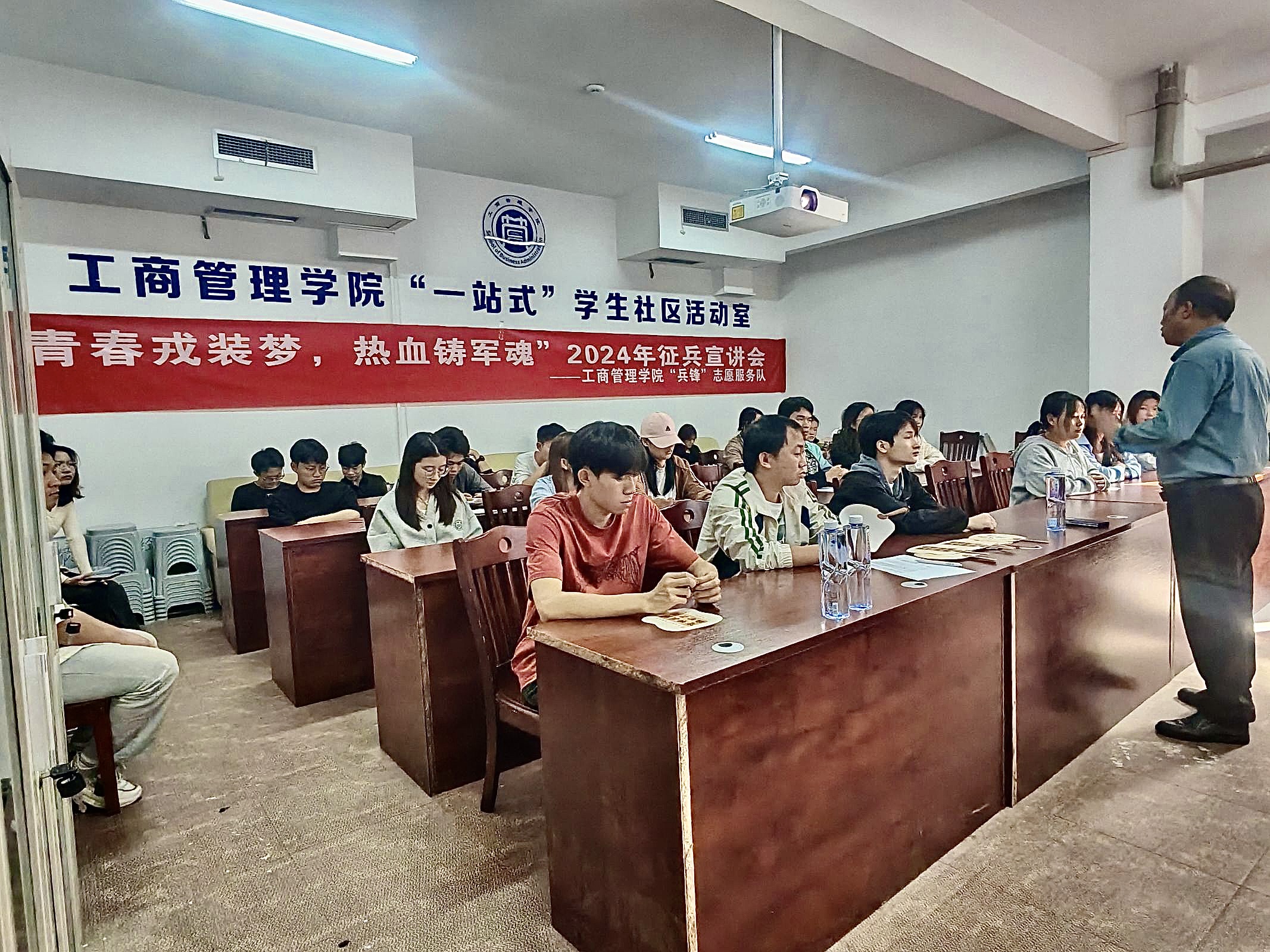 2024年11月15日,beats365官网入口“兵锋”校园志愿服务队联合公司武装部开展了“青春戎装梦,热血铸军魂”2024年员工社区征兵宣讲会。此次活动在翠竹苑三栋四楼活动室举行,邀请了武装部的胡细根老师和退伍士兵孙建成进行宣讲,员工社区共计45名同学参加。