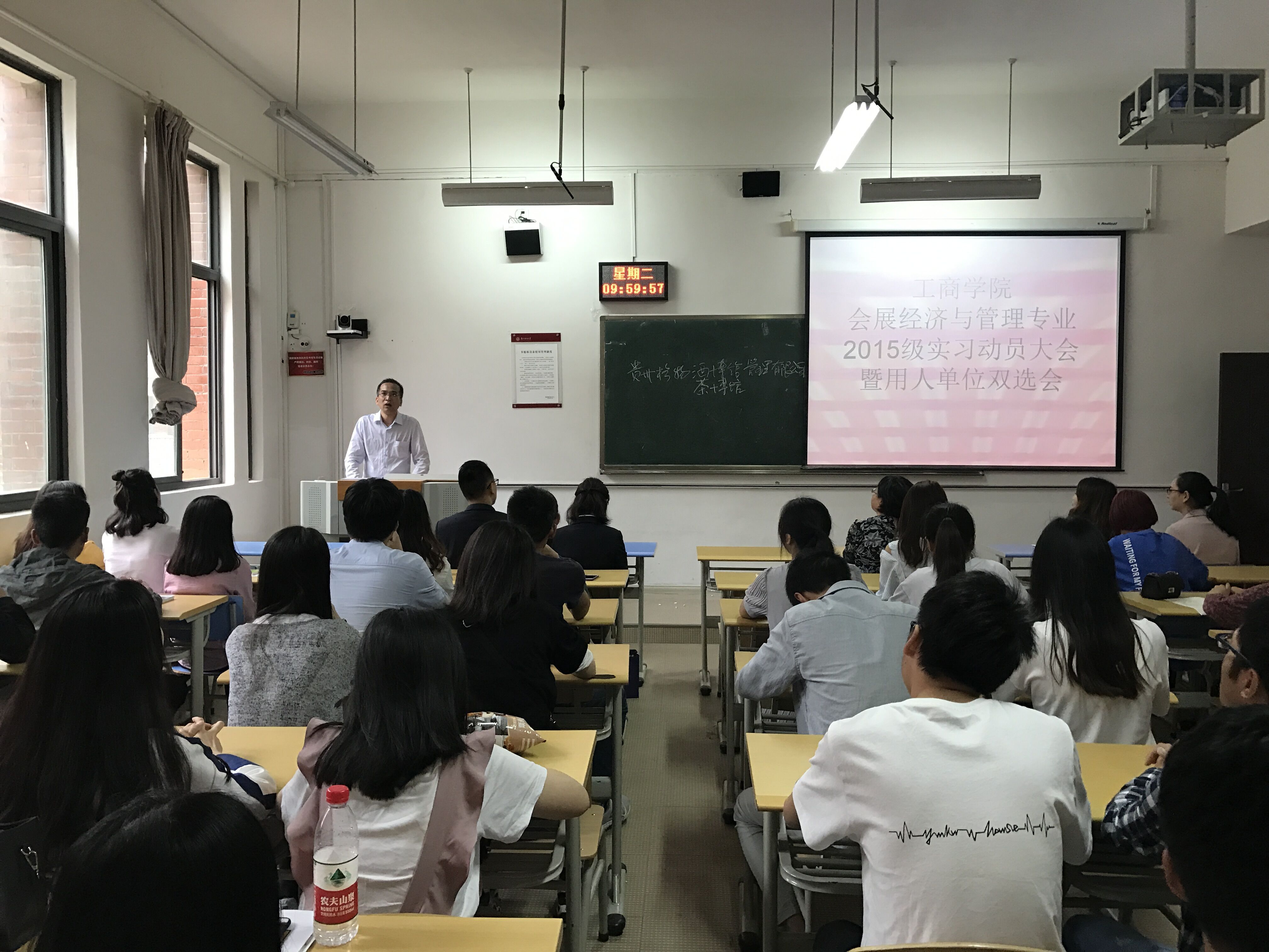 5月29日下午,工商公司在崇德楼四楼举行2015级专业实习动员大会暨双选会。贵阳中天凯悦酒店、贵州群升豪生大酒店、浙江开元酒店集团、贵州省博览局、贵州饭店,大成精舍、桃源河景区等十余家企业参会。工商公司副经理胡北明教授出席,旅游系各副系主任主持,各实习带队教师及2015级旅游系171名员工参加了双选会。