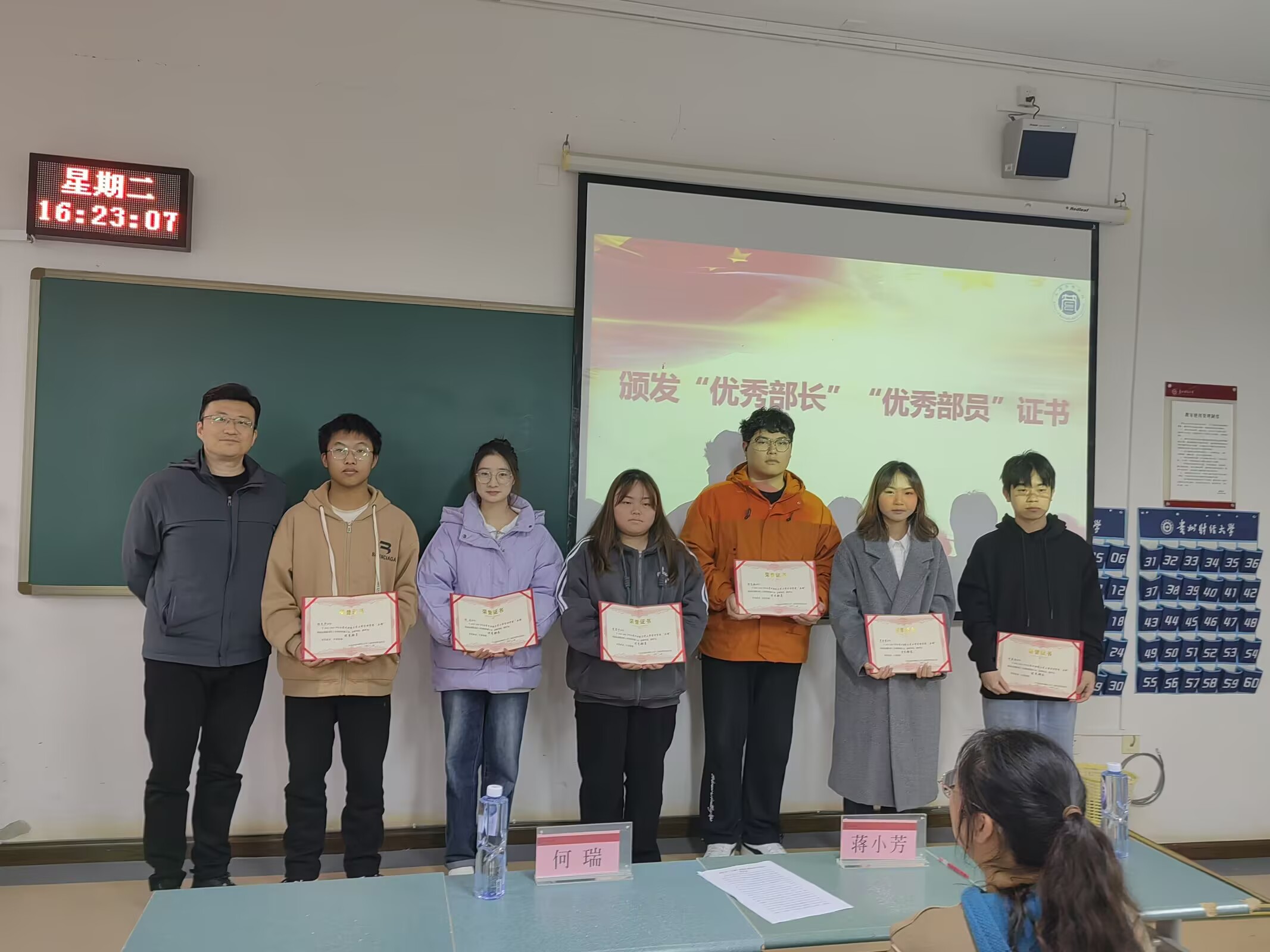 最后,由何瑞副书记向本年度优秀部长与优秀成员颁发了荣誉证书,活动结束后,何瑞、蒋小芳与“兵锋”全体成员合影留念。